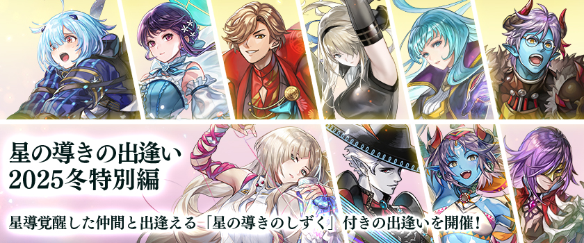 10人の仲間との出逢い後、 星導覚醒状態の★5クラスの仲間1人と出逢える「星の導きのしずく」 が手に入ります ※「星の導きのしずく」の有効期間は「星の導きの出逢い」を行った日から30日間となります ※Ver 3.13.50よりも前に獲得した「星の導きのしずく」は、Ver 3.13.50の「星の導きのしずく」の出逢いでは使用できません この出逢いでは、「グランジェネラルの星跡」を獲得することができます <星の導きのしずく> 「星の導きのしずく」を使用することで、下記のピックアップボーナス対象の★5クラスのキャラクターのうち1人と出逢うことができます ・ミルディ ・"夢吟の詩人" デュナリス アナザースタイル「ディオニュソス」 ・ニナ ・蒼色の忠臣 ・ミュルス エクストラスタイル「ウェネト」 ・黒衣の刀使い アナザースタイル「エトワール」 ・レイヴン アナザースタイル「プロフェット」 ・"茜袖の旅商人" シグレ ・碧光の鎌使い アナザースタイル「スウィートレディ」 ・リナリア ・"義侠の猟人" ラクレア ・赤套の炎使い アナザースタイル「ラストヘイヴン」 ・ヴェレット アナザースタイル「アークロジスト」 ・シオン エクストラスタイル「フツノミタマ」 ・ニルヤ ・"墨染の軍師" シオン アナザースタイル「オオクニヌシ」 ・コマチ アナザースタイル「サクヤビメ」 ・"氷塵の歌姫" ユキノ ・クレルヴォ アナザースタイル「リバイバー」 ・カグラメ |